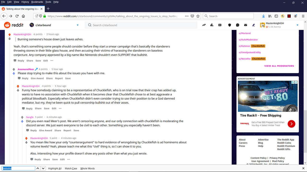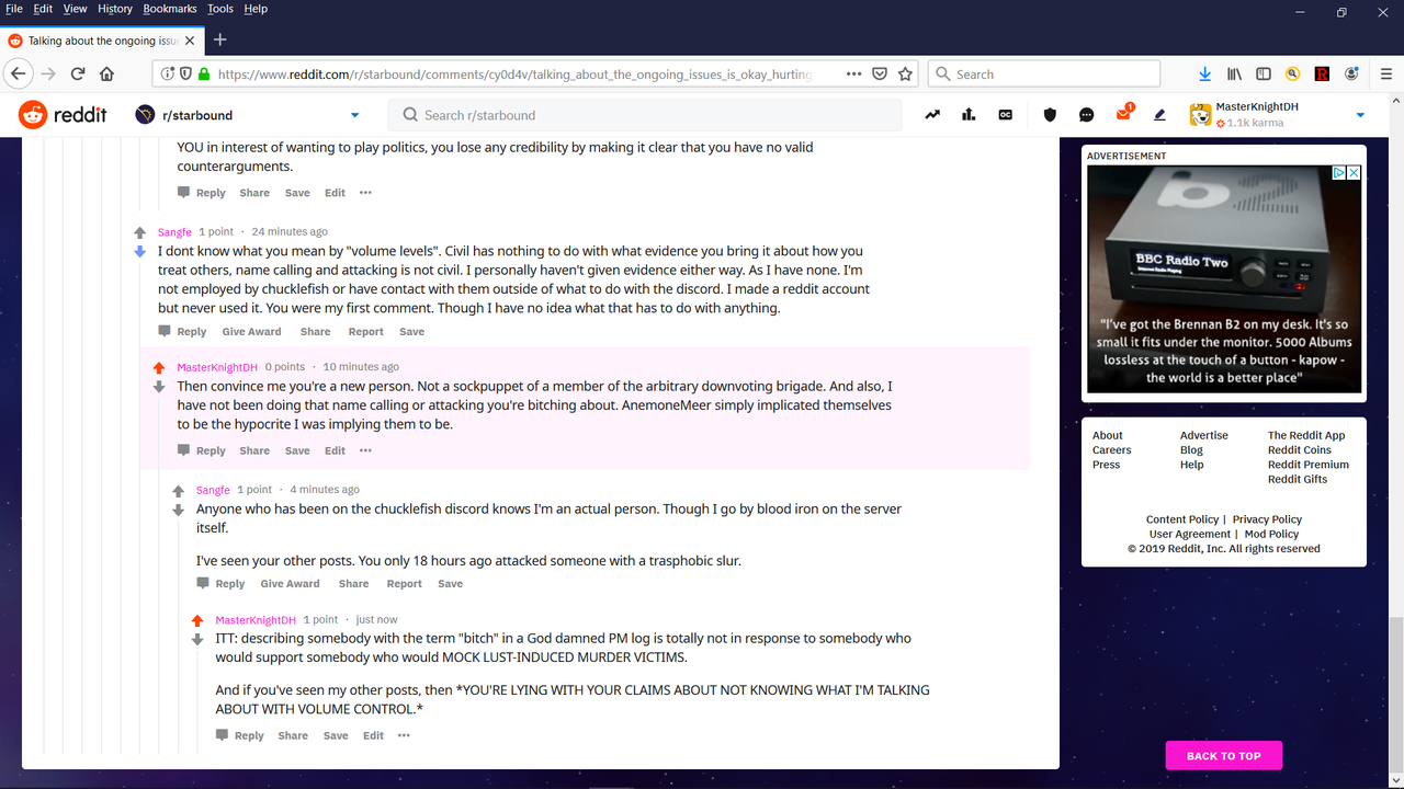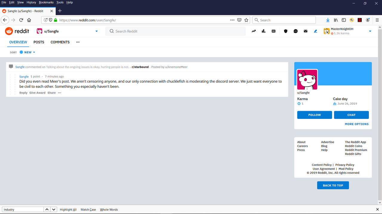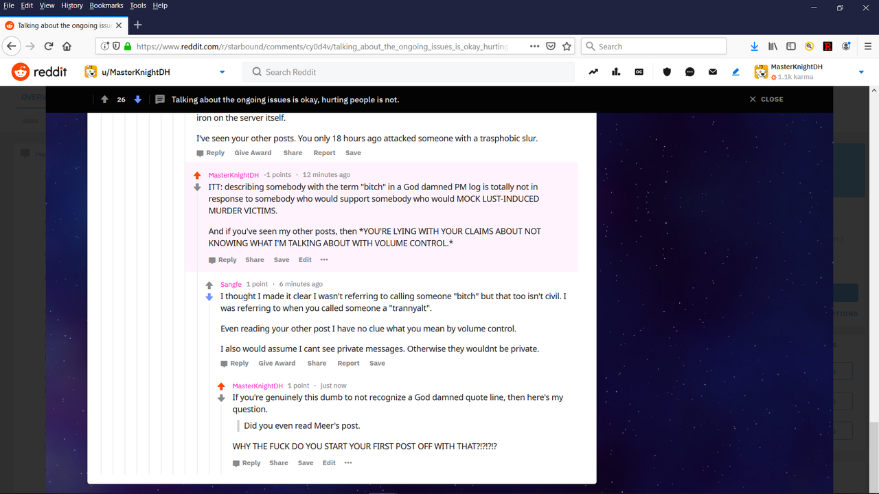 The Starbound subreddit wanted evidence. But they don't want to go through the trouble of typing in a God damned URL clearly shown on video snapshot for an outsider's cross-exammination. I say they're just sycophants. There's simply NO other explanation for a "new" person clearly skimming my profile while telling me I should read an already sadistic Bitch In Sheep's Clothing's post more extensively when calling out her hypocrisy, in a manner where the BiSC even implicated herself.