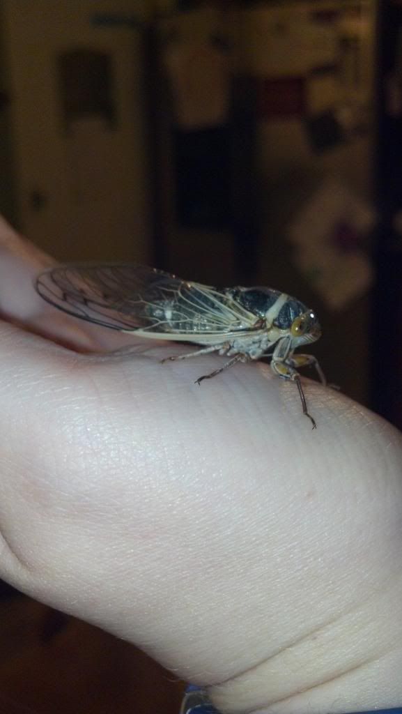 Caught this guy in my mom's yard yesterday. He was buzzing around in the pine tree trying to find a spot to land, and he ended up just dropping down in the grass. So I picked him up and he let me hold him long enough for my mom to snap a few pics with her phone. He flew back into the tree after. I love cicadas, their wings look like faerie wings. :D