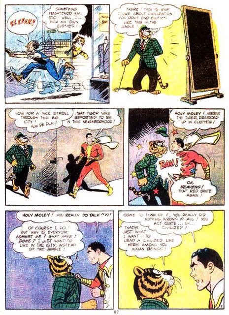 Even waaaay back then as a kid I r'member when I first saw this character an I was head over heels in love... He right then an there b'came my idol... A friendly tiger who by fiendish circumstances of an arch enemy of Captain Marvel, gained the ability of speech and opposable thumbs... Tawky Tawny broke free of his cage an tried ta make an honest life for himself... but he always frightened people... (huge tiger walkin' upright... does tend ta annerve some folks I guess) so they sicced Captain Marvel on'im... but when Cap learned Tawny was really a good guy an meant no harm, he helped the big kitty get a nice suit an good payin' job... I think he became a detective if memory serves me...