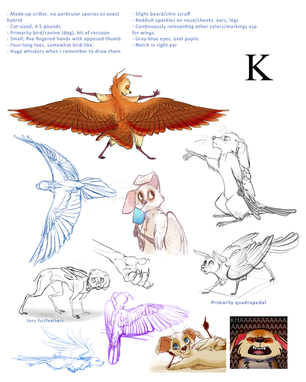 I am calling the species "fluffwing" since I can't think of anything better. It has a flatter face with a nose that extrudes off kind of like a koala or something, doggish ears, short little limbs with fleshy palms, a medium length puff tail, and of course, the most distinguishing feature: wings! The wings are supposed to be made out of a stiff fur instead of feathers. I assume there is some sort of webbed flesh under them a bit on the upper area if you were to shave this creature. The markings and colors are based off of birds. :)