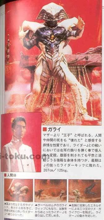 The oldest of the Fog Mother's children, assuming the form of a youngman. He is called the "Prince" from the Fog Mother. His true form is Cobra Man. An armored cobra-like monster who wields a laser saber, a constricting whip, and can use a ball that can turn into a claw. He preceded to carry out the ceremony while his younger siblings battled J. He eventually took on Kamen Rider J himself to keep the sacrifice going, until Berry came to his aid in vain. But with Kana now in the egg chamber and Berry knocked out, Garai absorbed the surround mist to assume his true form. Garai was even stronger in this form when Kamen Rider J impaled a sharp object in him. Garai used his ball attack on him. When Kamen Rider J got free from it, he used the Rider Kick to knock Garai unto the alter, fatally wounding him.