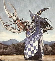 A bladed Youkai under Junior's command who swore a vendatta on Saizou for the fact his ancestor chopped her arm off in a swordsmen-type duel. She replaced it with a bladed prosthesis provided by Prof. Yugami, which she used by launching the blade on it like a missile. While posing as an attractive swordswoman in red, with a black gloved prosthesic arm, she attacked Saizou in their first meeting, cutting his SUV and clothes to pieces before revealing her true form. With Junior's aid, Amikiri obtained a boy named Toro as a hostage to force Saizou to fight her. Amikiri overpowered Saizou at first, but Toro's photos gave the gang an edge of knowing a flaw in her prosthesis arm. While the others took out the Dorodoros, she and NinjaBlue dueled at sunset, with NinjaBlue focusing on her using his square-cut technique to finish her off. When Amikiri grew, she was still bent on vengeance. The Kakurangers immediately formed Muteki Shogun to finish off the Youkai with the flaming sword attack.