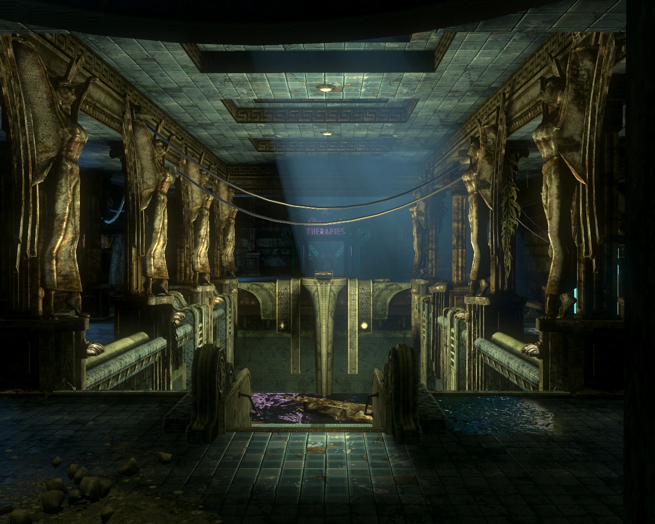 This is the swimming pool, enclosed in a large glass room that looks like a greenhouse. Its been derelict so long there is actually a tree growing through the glass roof. Through the windows on the right are the badminton courts.