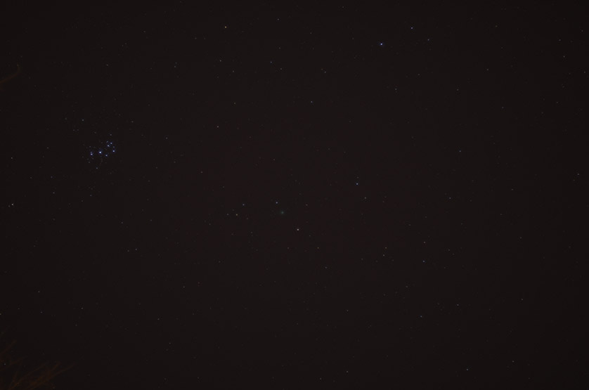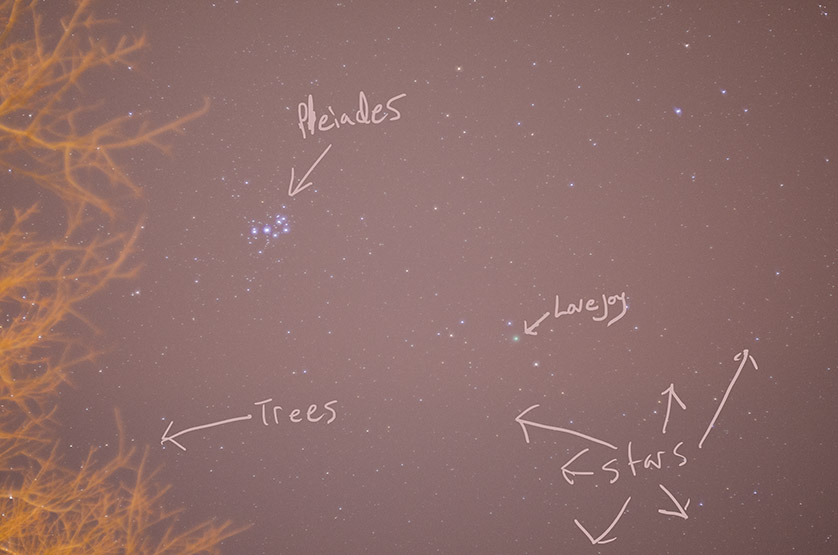 http://www.ericstrother.com/downloads/EMS_1726.jpg Shows Lovejoy in relation to the Pleiades that night. Also, much light pollution.