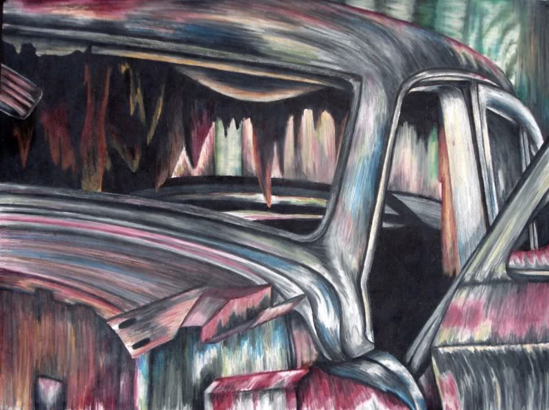 These series of twelve pieces you see here are my concentration. They are all done with Prismacolor pencils on paper, size 'averaging' around 16 inches wide by 12 inches tall. The concentration contains the same subject matter, all tied with a central idea. I could go on and on about my idea, but to make it short and sweet, I believe that the condition of car tells its life story. They stubbornly linger on the side of the road as a testament to our past, a piece of Americana that should not be forgotten.