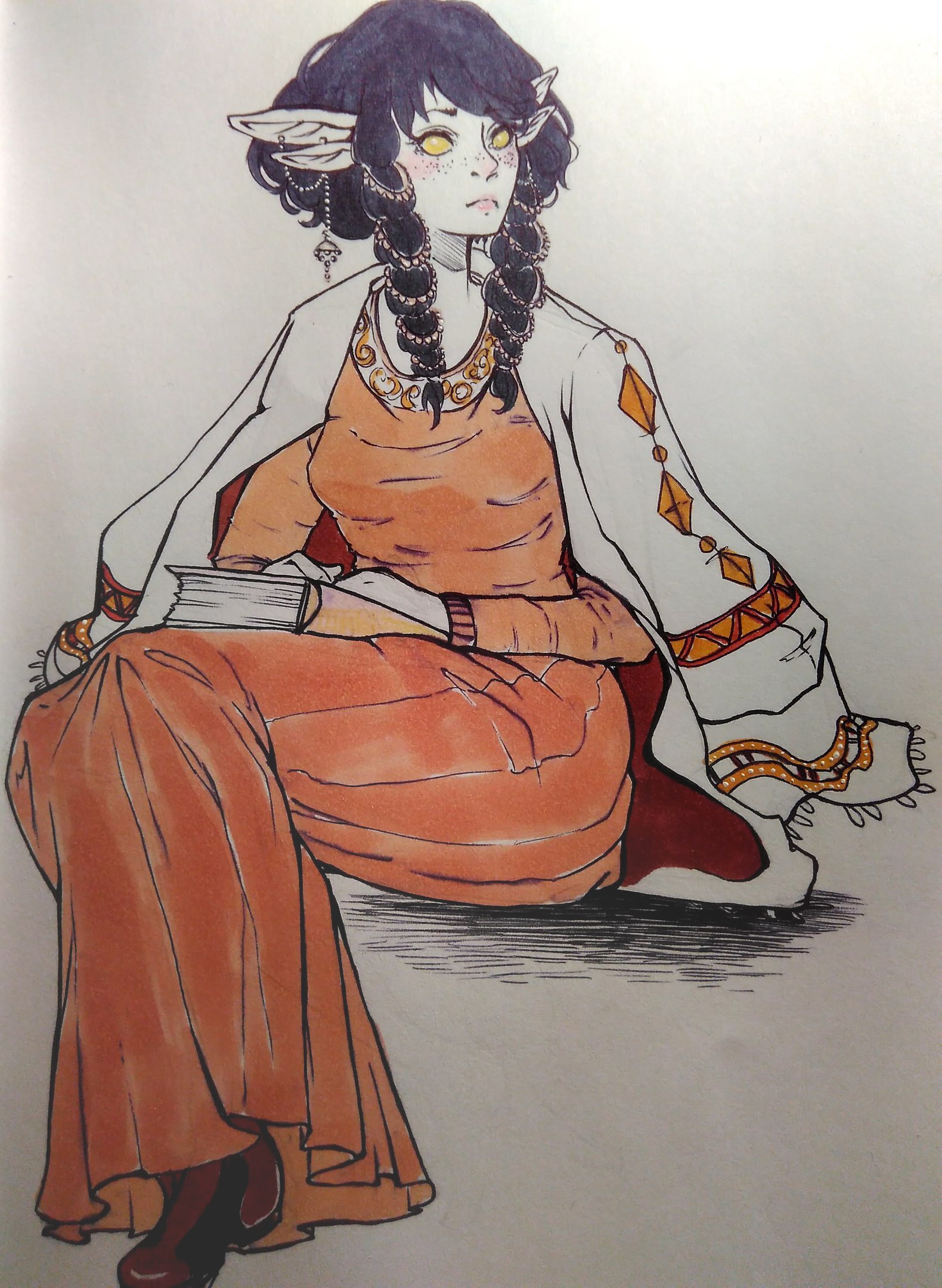 I held a contest a long time ago, and my friend won it, and I had to draw her a ref of her T'larr char as a prize. She's so adorableee waaaah I just can't, and has a good story behind her, but it's like, too long. In short, she always wanted to be a doctor, but since only higher castes can be doctors snd such, she leads a dull life as an apprentice in her parents' shop, and those parents are rather toxic and don't let her aspire for something more than this and get in the way of her hobbies.