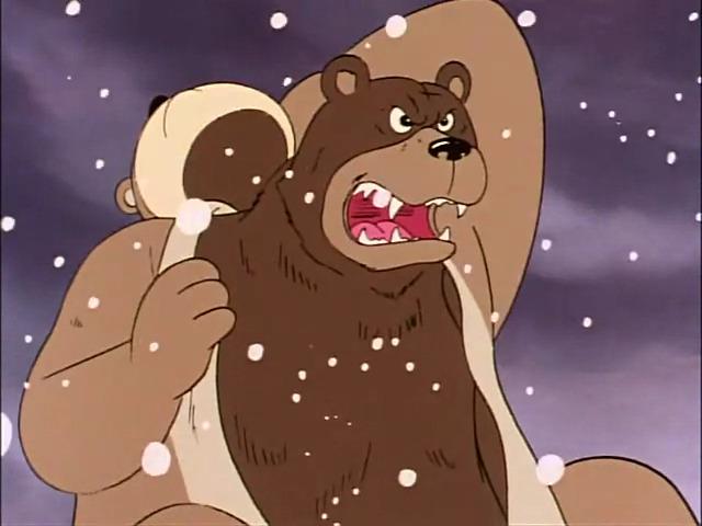 This reminds me of that Kinnikuman clip where he starts fighting a guy in a bear suit, and then he takes the suit off and underneath is another, more realistically drawn bear.
