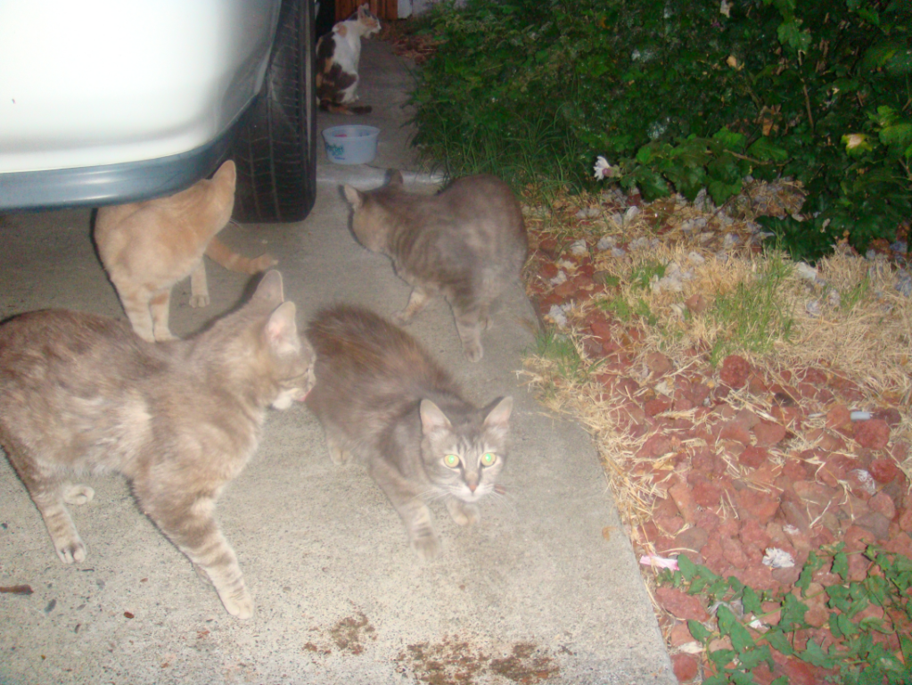 The kitten (nameless at this time) has Senna's face, orange markings like Senna and some tabby markings like Boton but she has a full tail unlike Boton. Boton has a reputation of abandoning kittens to people who give her food according the the neighbor lady next door and feral cats are also known at times to do this to a human who brings food. I waited a long time for Boton or one of the other females to claim her but none of them did. They were too focused on eating and then left to groom themselves. It was getting dark and there are dogs out on the streets because people are lazy and don't keep them on leashes, so I decided to take her. I was very careful not to touch her before that time. None of the females came back to get her. I suppose cats have their reasons why they abandon their young like this to people who bring food, but Buton is on the list to be one of the first females to be spayed if I can get her. Bad momma! Or good momma, depending on how you look at it.