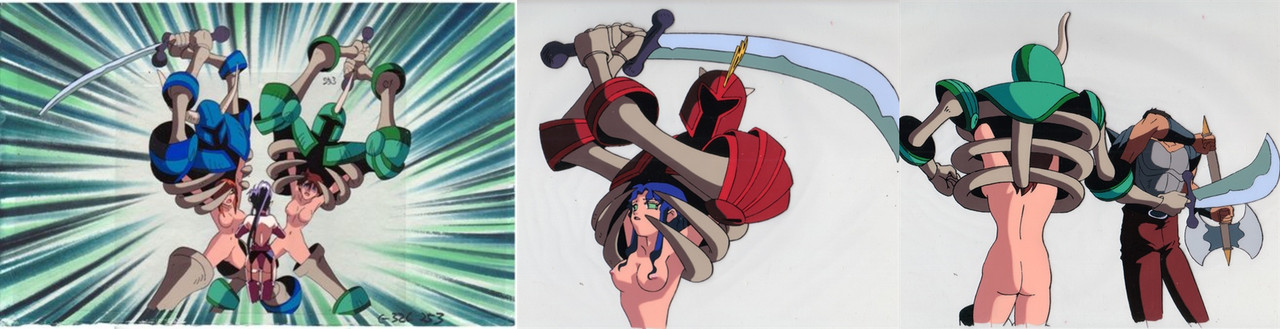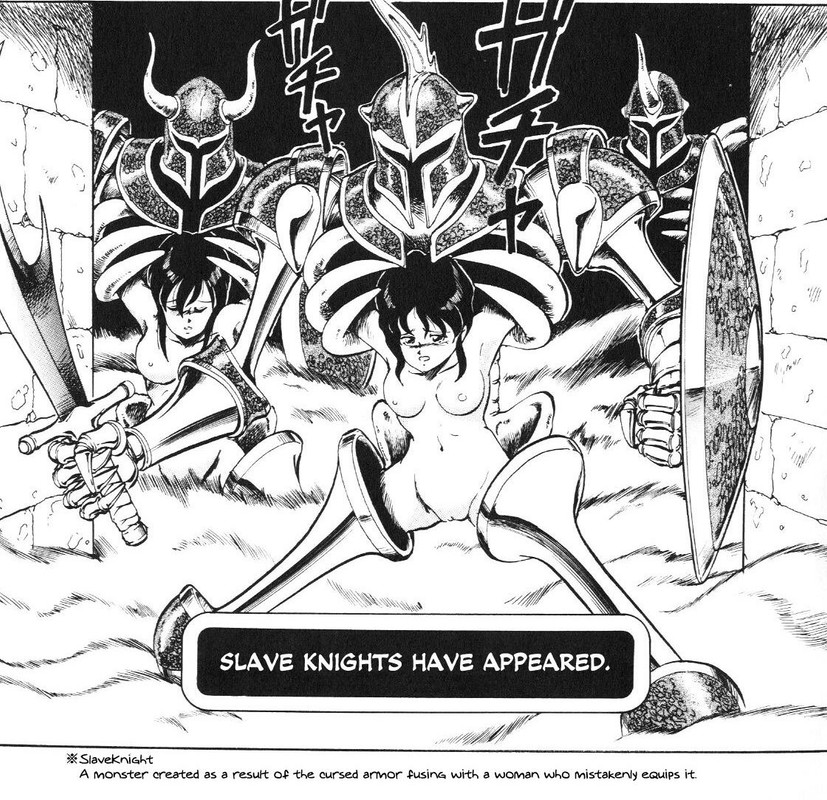 Slave Knights their monster concept/designs are from the hentai anime/manga series Dragon Pink. Slave Knights are monsters that are living cursed skeleton-like armors/monsters are permanently fuse with a nude woman who mistakenly equips it, and they catches young girls in theirs body to act as their living unwilling core. If someone kill a Slave Knight, the girl is killed with him.