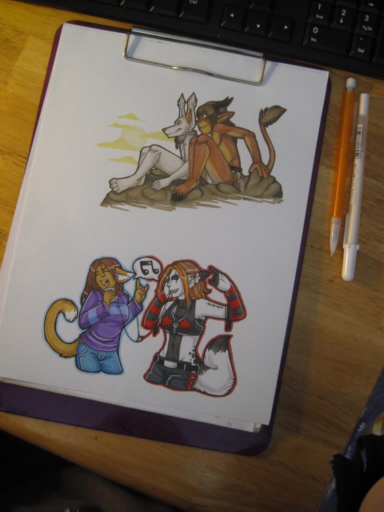 's Cat on the left and my Ixy to the right, rocking out! Though I suppose I should leave that to the viewer's interpretation - but *I* was listening to 'Slipknot' while working on it, lol. Otherwise, this was really fun! :]Also, once again drawn on the (same page) as before!