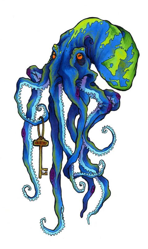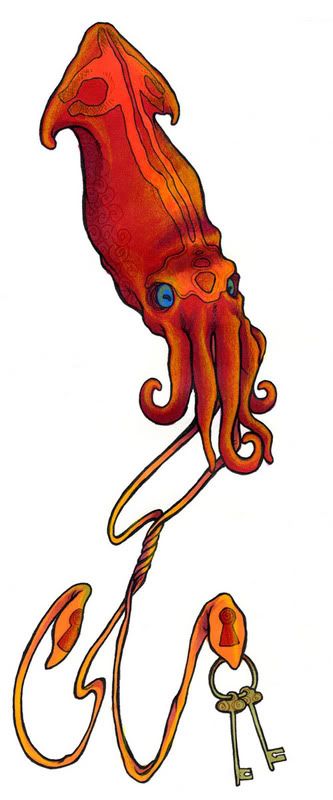 And after near a FULL YEAR...I have finally completed my half of an art trade with the talented http://www.furaffinity.net/user/sarahsilver/ She asked for a brightly coloured octopus with a skeleton key, and also showed some interest in a squid possibly in the future as matching tattoos. Well, I made you wait forever and a day hun, so you get the squid whether you like it or not c: Sorry for the insane long delay with these guys!