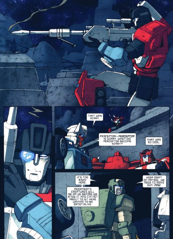 Perceptor, if you go back to his orignal techspecs, actually was part sniper. The scope working as a large cannon as well. But those were mostly things that got forgotten by the writers. While I'm not fond of the idea of lobotomizing Percy to get the result, its nice to bring back that aspect thats never been explored.