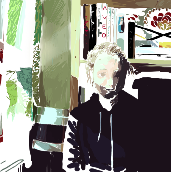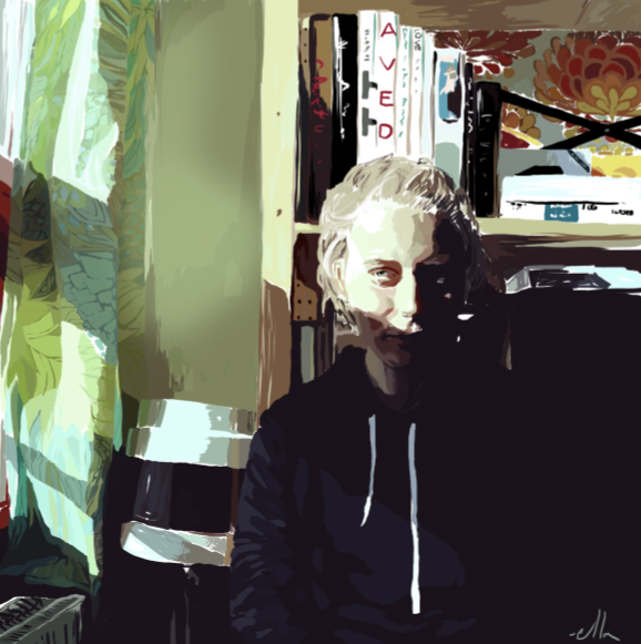 Awww, mate this is mint! I want to have a go now. Love the minimal amount of highlight on the hoody and how you managed to get the right amount of shading on the face. Don't worry about giving up on the curtains. You did the wallpaper and book detail to make up for it. ^.=.^