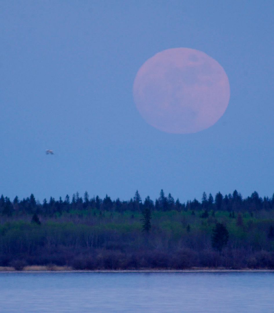 I'm fascinated at the images one can get of the moon rising, or setting, and especially under unusual conditions like fully full, or the faintest of slivers. Here's my first try at catching the full moon while the sun is just setting. Sorry about the low light and cranked exposure, this is done with a long 500mm lens with a rather high f-stop of 8.0. You use what you got though, and only dream when you've got the money to do so. This is the same moon, slightly later and much more visible.
