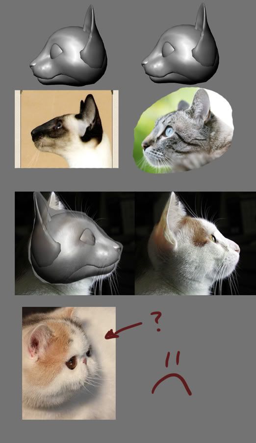 In all seriousness though, my design was based off allot of common house cats (and my own). Here are some random pics I nabbed to show in comparison (ignoring the fact our head has a more human shaped brow) - http://i6.photobucket.com/albums/y2.....g?t=1282478615