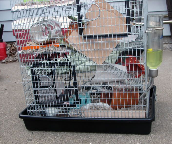 Tikky is helping me quaratine them, good thing because one of them turns out to have a URI.The cage was in poor shape when I got them: