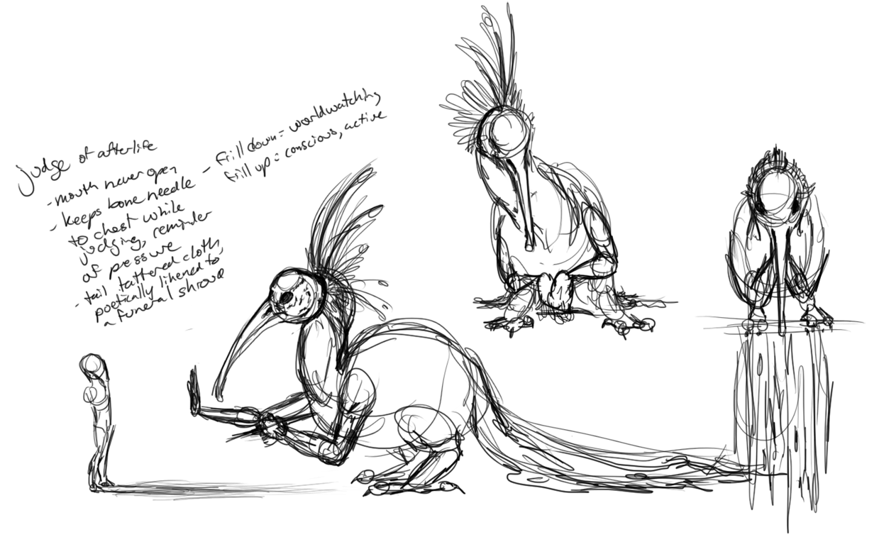 Anyway, he acts as the judge of the recently deceased and the watchman of the currently living on Vride Skriv. When not judging he stands (perched apparently on a floating thingy) in unmoving 'prayer', with his pseudo-eyes open. When judging his frill raises, the eyes close, and he becomes much more mobile, a la these scribbles.