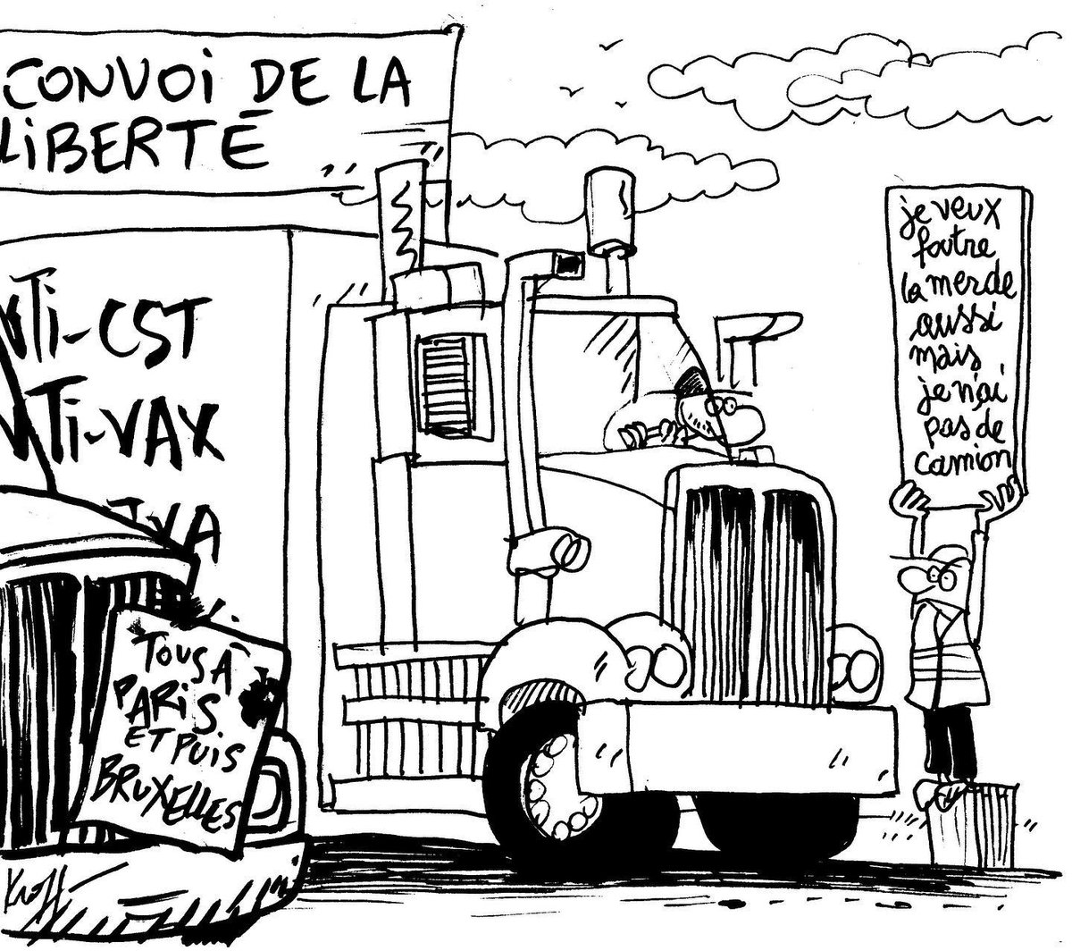 Sinon, j'espère que les "convois de la liberté" n'ont pas trop mis la pagaille dans ton coin. C'est assez surprenant de voir ce genre de mouvement assez "typé" politiquement au Canada, alors qu'en France, les Gilets Jaunes et autre groupes similaires font déjà parti du paysage. Allez, juste pour le plaisir malsain de ne peux m'empêcher de partager ce dessin à la fois génial et très discutable du dessinateur Belge Pierre Kroll : https://pbs.twimg.com/media/FLUj8AhXMAAsMv7.jpg