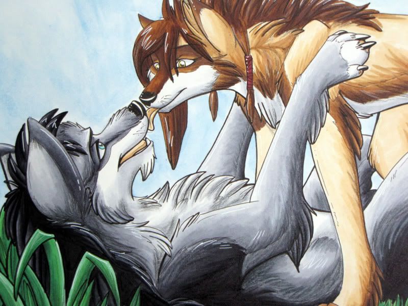 Second pic for the auction. A cute male and female wolf couple playing in the grass :D
