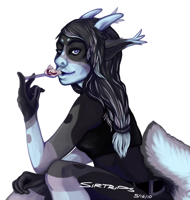 Feverdog done back in May. (Still waiting on her half).Her character, Charmion, request: "something flirty with her eating a piece of cake". (Failure on the "cake" on my part-- what the hell kind of cake is that??-- s-sorry..)