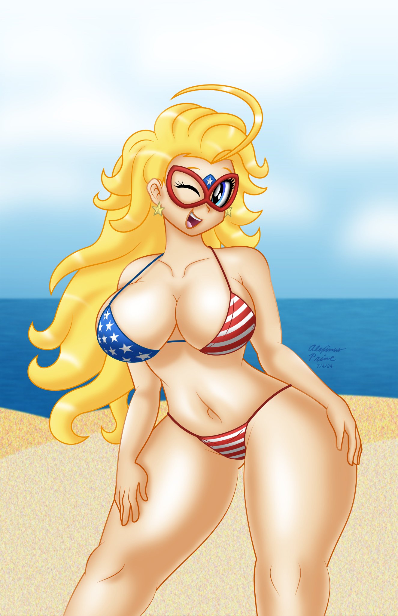 aleximusprime manga kamen america kamen_america kamenamerica charlotte carly vanders carly_vanders carlyvander blonde blondie bombshell mask cleavage big large breasts huge boobs juggs tits titties boobies wide hips thick thunder firm plump thighs curvy voluptuous wink winking beach bikini swimsuit 4th_of_july adorasexy sexy seductive cute cutie navel belly_button belly button patriotic american flag american_flag_bikini dummy_thicc thicc skimpy thong femaleReport this content