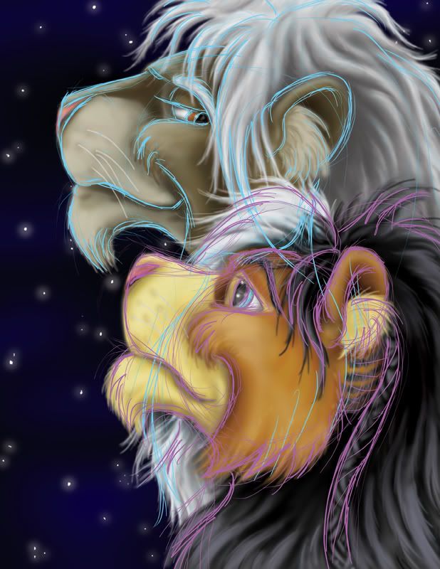 That's the original background aspect before I decided to move the lions off of it and make it wallpaper scaled. But you can see the sketch and "ink" lines for Sar and Tens there, I just did it all on the tablet in contrasting colors; I then color UNDER the lines, and remove them when I'm done. The constellations I sketched in pink, and drew the turquoise over the sketchlines, which is how they're light and not black.