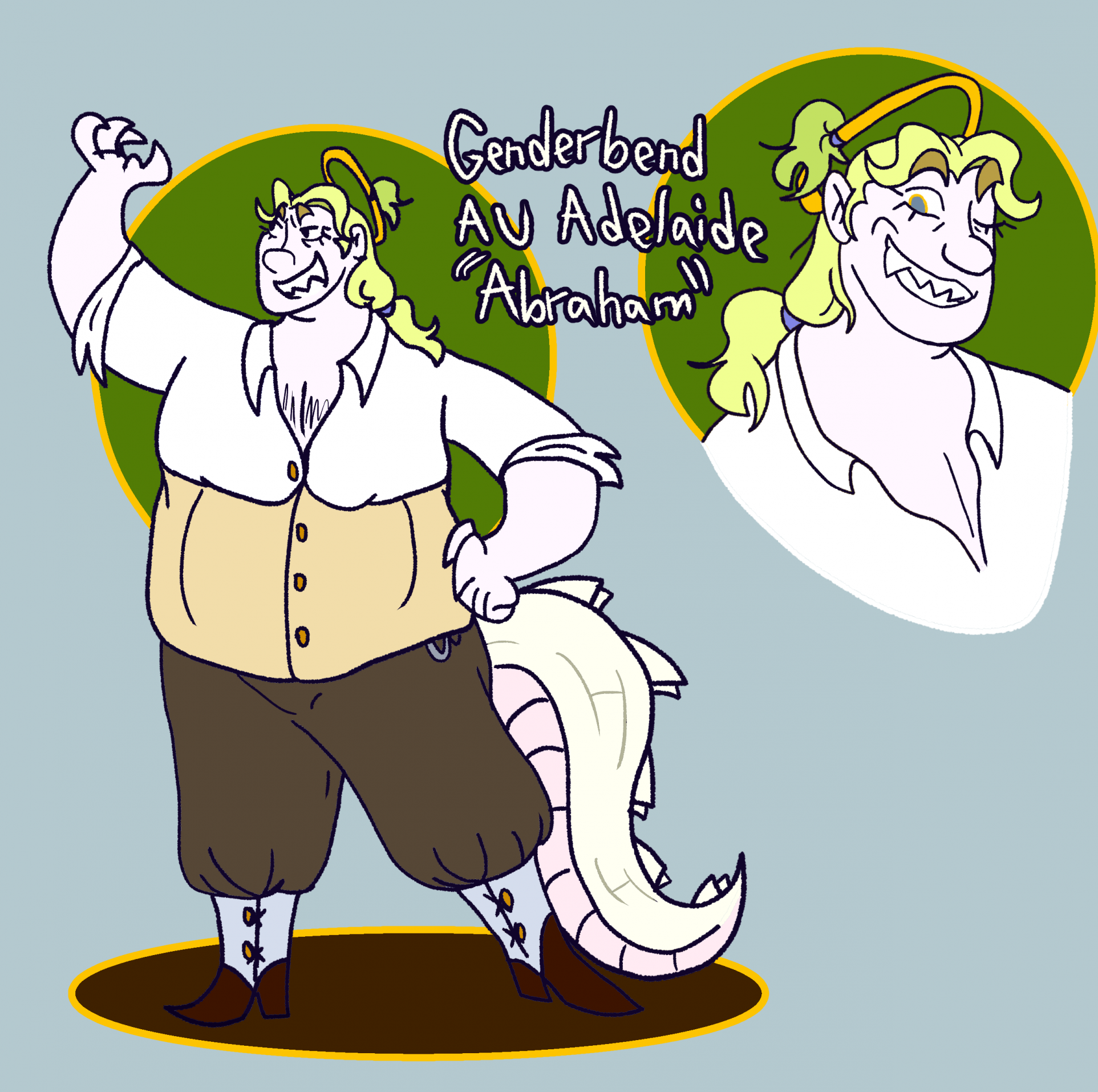 I like tossing around the idea of gender swap AU's for my characters and Abraham, the swap for Adelaide, is definitely a favorite. A big theatrical gnc woman would be a big theatrical gnc fella, I think. He would be much more public facing I think, in a way I like a lot