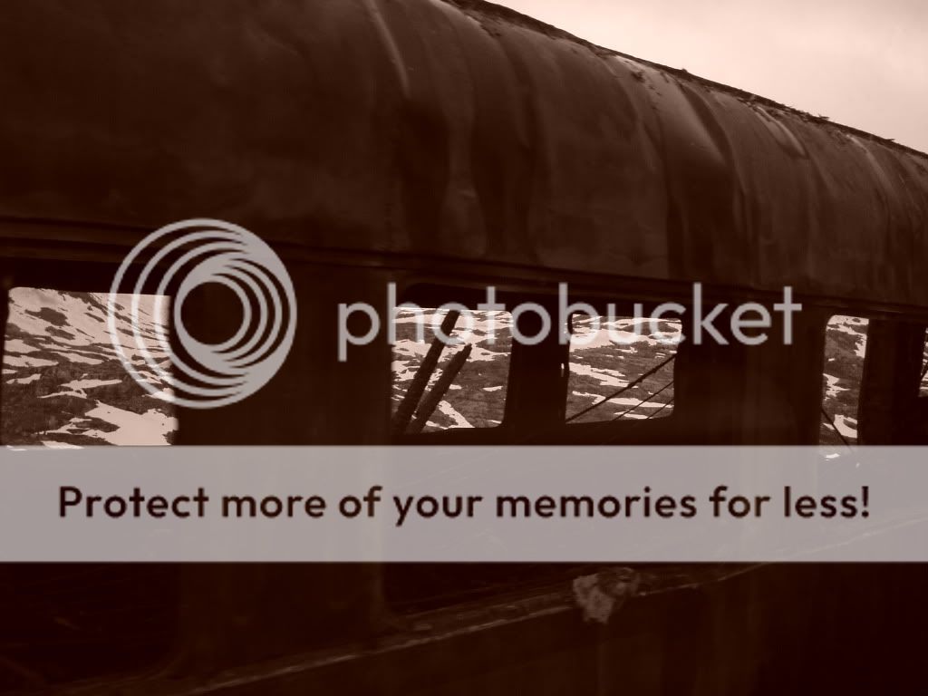 the remains of the burnt-out train on the Bergen - Oslo Train Line from the 06/16/2001 fire at Hallingskeid
