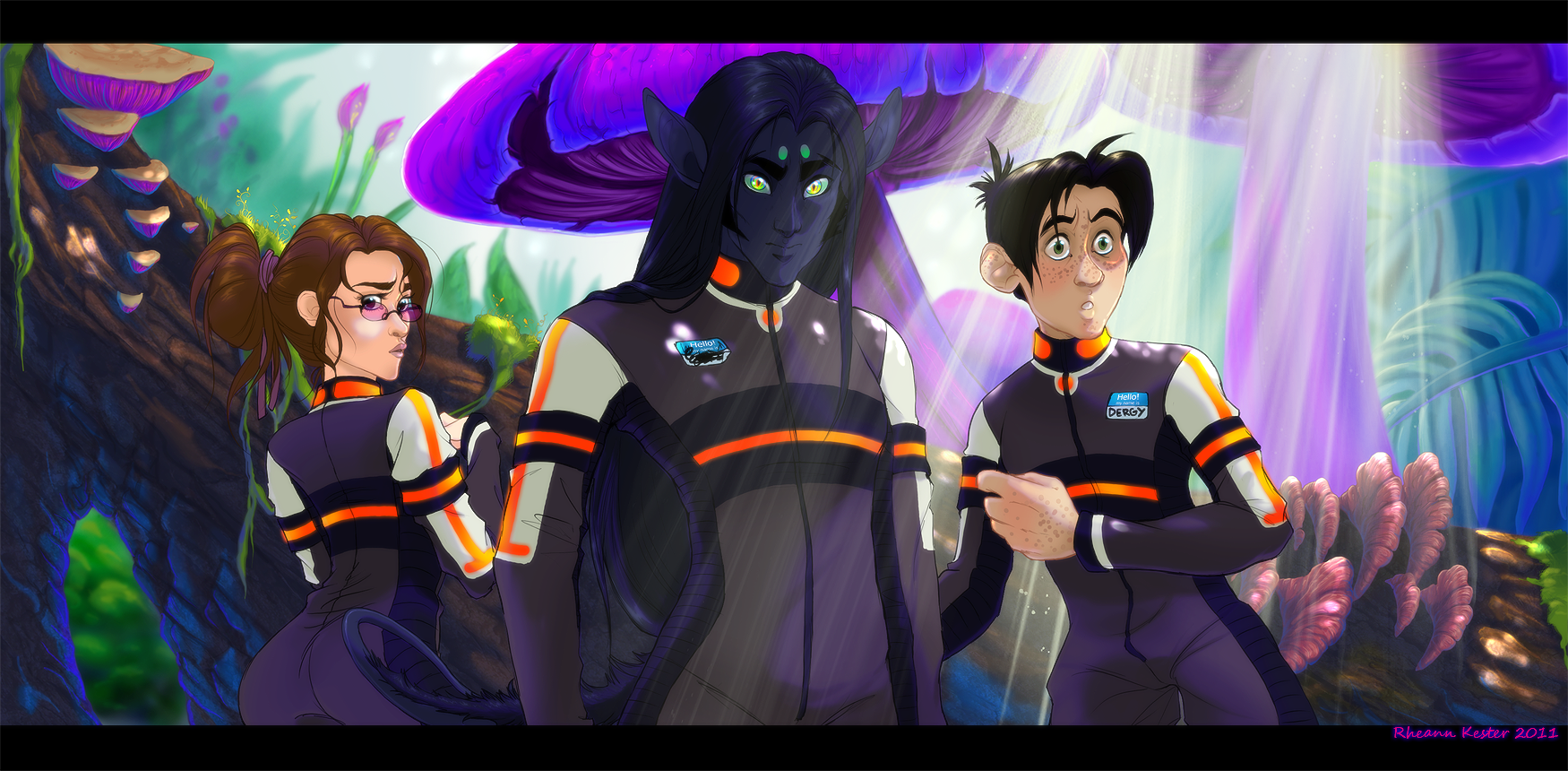 Nim, Dergy and Ruga gathering spores from Titan Mushrooms in the futuristic jungles of South America.