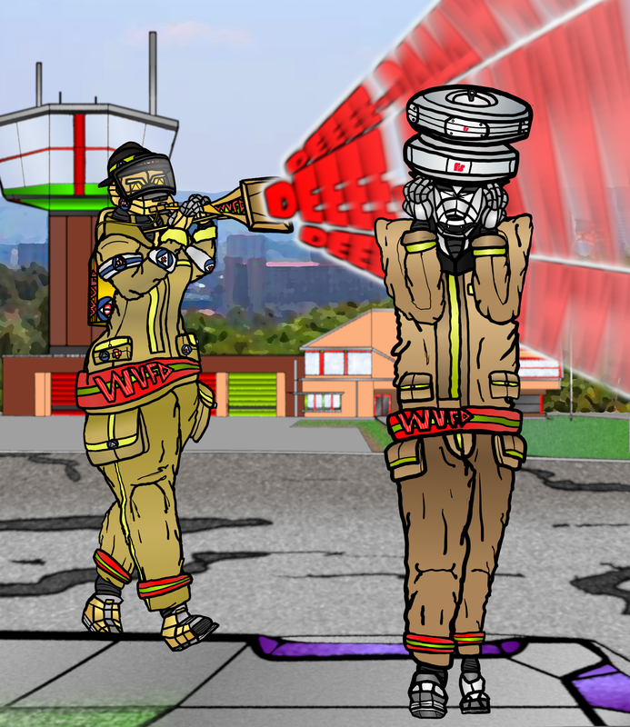 Both sometimes mounting themselves atop the firestation airfield's control tower, his siren job is mostly handled by his grandmother since he's scared of his own tones to the point of outright refusing to play them (barring the Westminster Chimes test tone which he's basically autistic about, and sounds it off literally every hour he's awake), but his use as a community-wide announcement system for the town is whats going for him currently, and when caught in a good mood, is quite a great orator due to his use as an PA system, which many store-owners and the town's Mayor use him often for town-wide announcements of store sales, events for the town, advertising, "state of the township adresses", and obviously warning messages if the need arises.