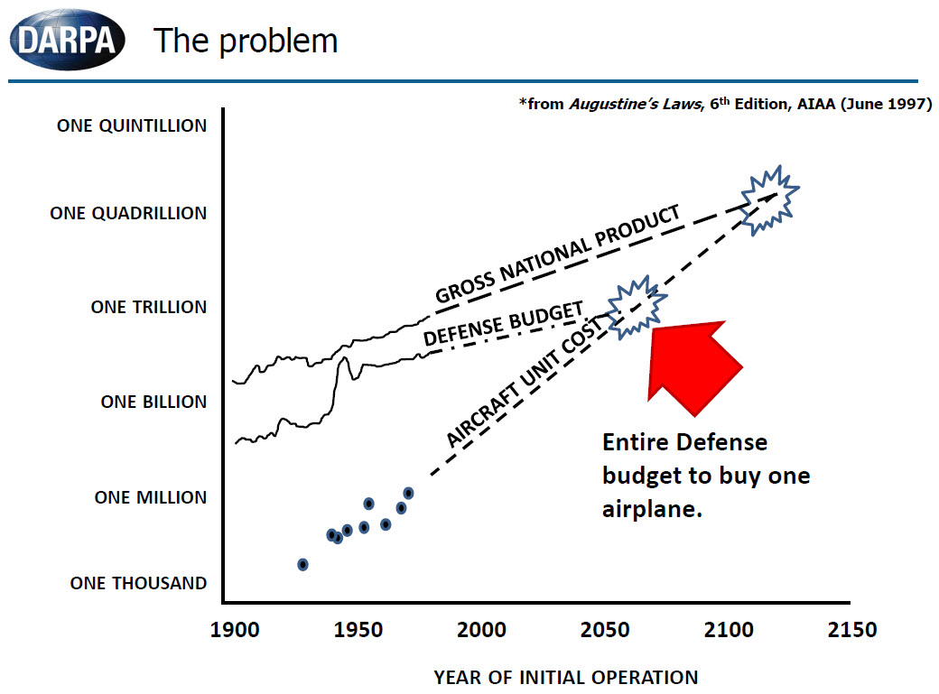 You'll also notice that as the complexity and cost of the average combat aircraft increases in air forces worldwide, their inventories decrease; something the Blitzfighter would have gotten ahead of. This was first brought to public awareness in the early 1980s by Norman Augustine.