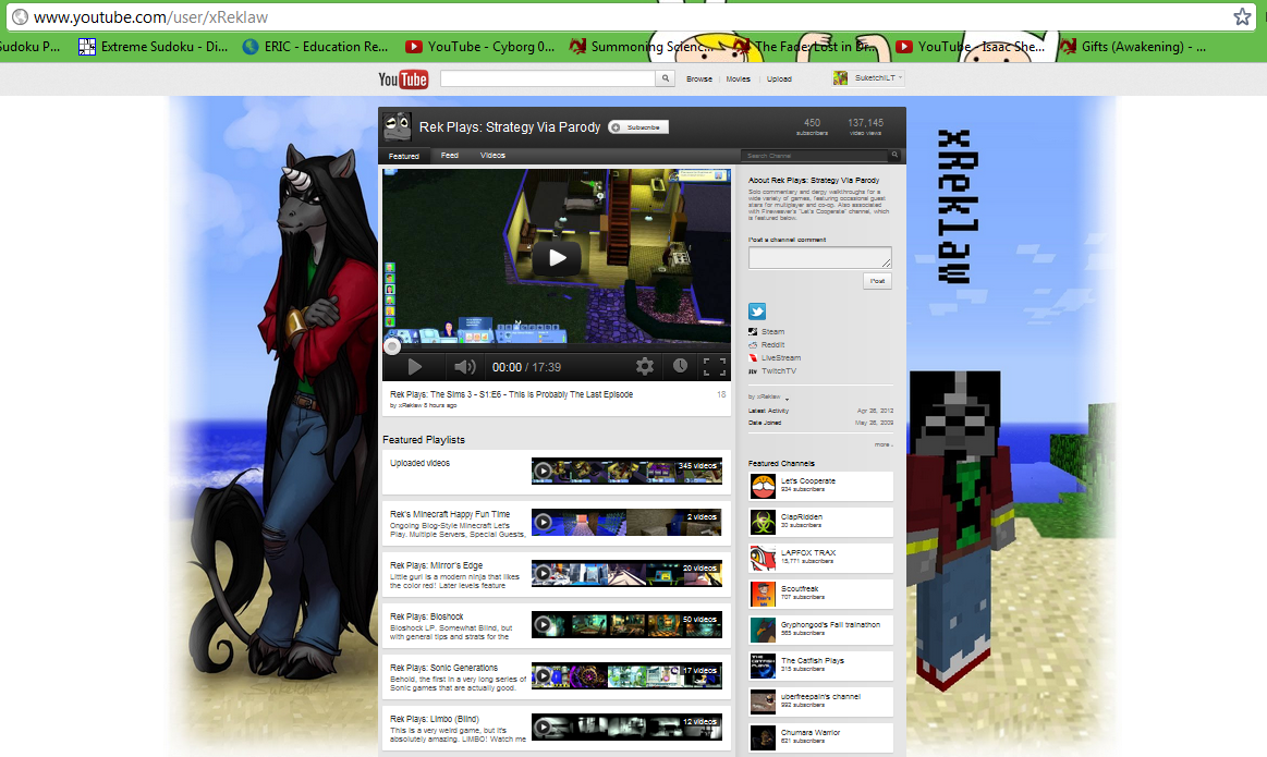 Commission for Reklaw of his character as a YouTube background for his channel. C: TEAM EFFORT. (He took and adjusted the Minecraft guy. He also edited out the cats. EHEHEHEH.) Reklaw belongs to Reklaw.