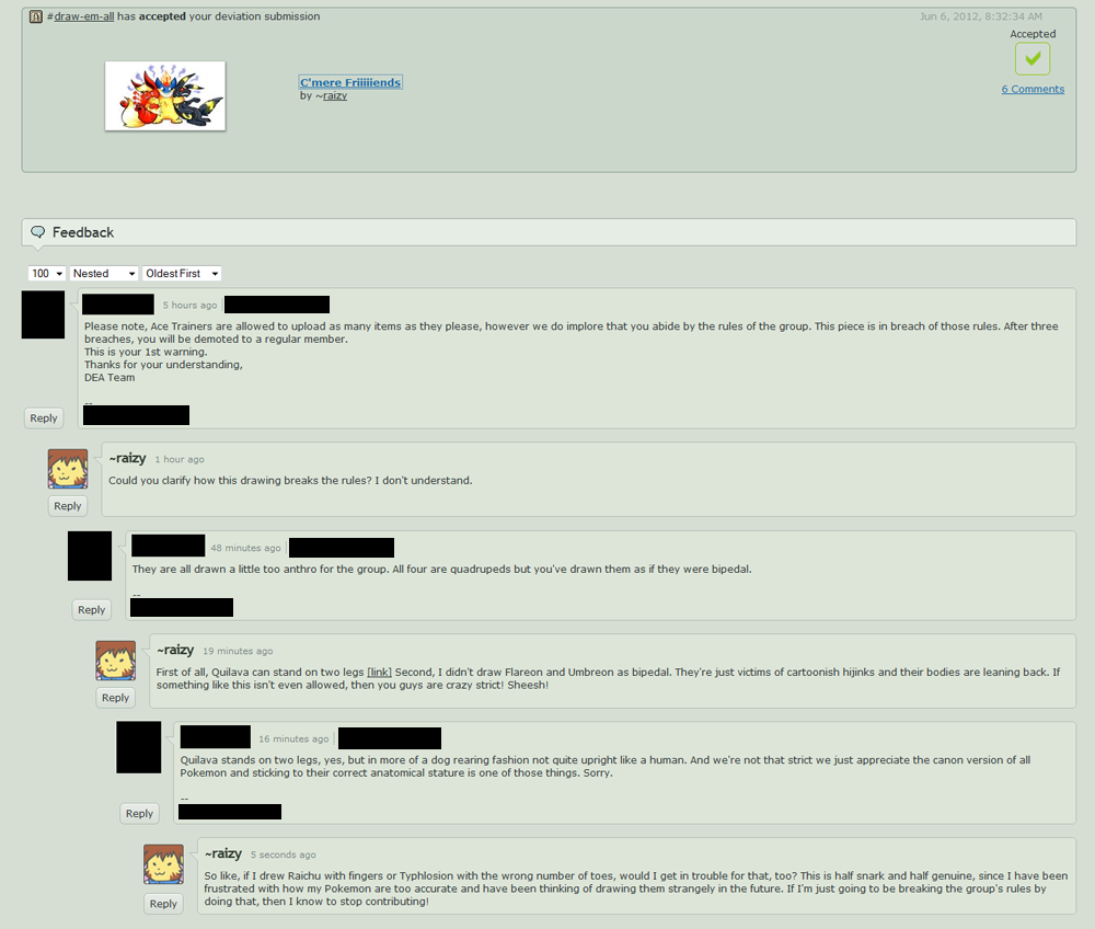 I understand that draw-em-all has the right to warn and reject any submission they want. But that doesn't mean I can't draw whatever I want! (it just won't be allowed in the group.)
